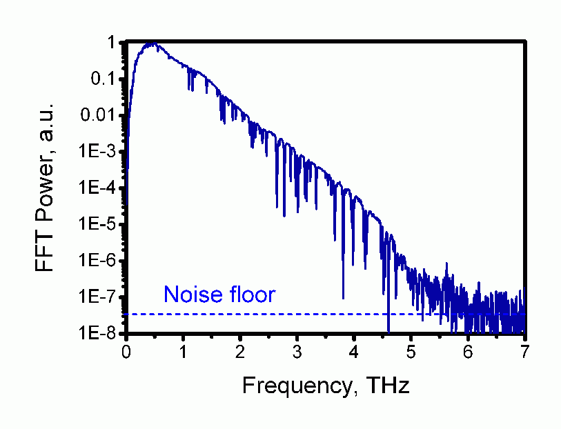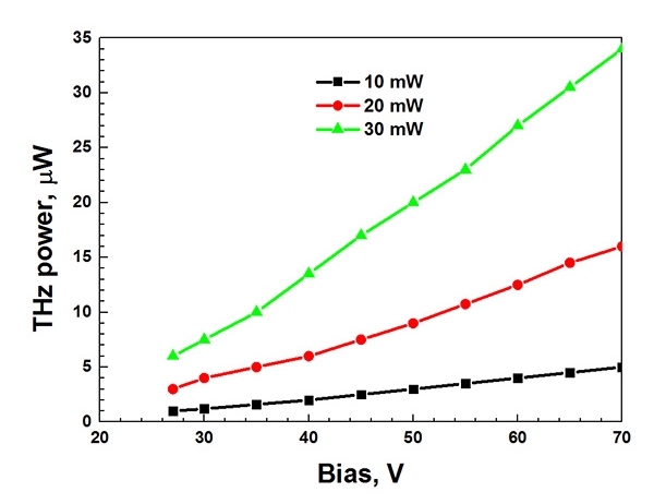 THz emitter/detector consists of a micro strip antenna integrated with photoconductor. Low temperature grown GaAs (LT-GaAs) is used as photoconductor. Total GaAs substrate thickness is about 350 µm, dimensions of single antenna substrate is 1.5x5 mm. Antenna is formed using AuGeNi metallization. Two types of emitter antenna is available (Fig. 1 and Fig. 2).