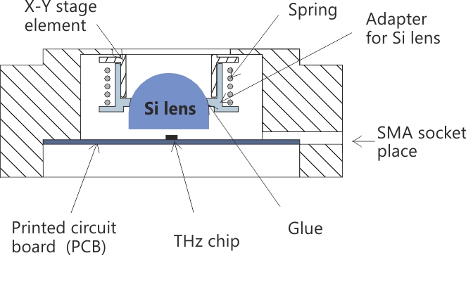 Detector/emitter mount consist of printed circuit board (PCB) used to attach detector/emitter, silicon lens and integrated XY stage for silicon lens adjustments. Technical drawings are shown in Figure 1 and Figure 2. Typical set consist of 1 PCB, 1 silicon lens (see availability of silicon lenses under item "Silicon lenses"), 1 integrated XY stage with micrometric screws for silicon lens adjustments,1 SMA socket.