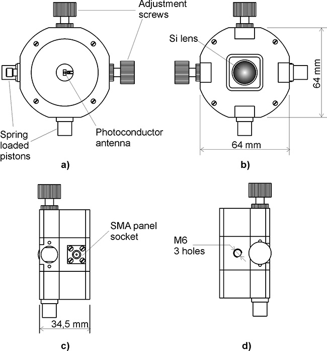 THz emitter (detector) is illuminated by laser beam from panel (Fig. 4-4 a) side. Laser beams must be focused into photoconductor antenna gap. In the case of THz emitter Si lens (Fig. 4-4 b) is used for THz radiation output. In the case of THz detector Si lens is used for THz radiation input. Adjustment screws are used for Si lens positioning in point of view of microstrip antenna center. SMA socket (Fig 4-4 c) is used for connecting DC bias voltage source to the antenna (THz emitter case) or while connecting lock-in amplifier input with THz detector. Any of three M6 holes (Fig. 4-4 d) can be used for THz emitter (detector) mounting on optical table.