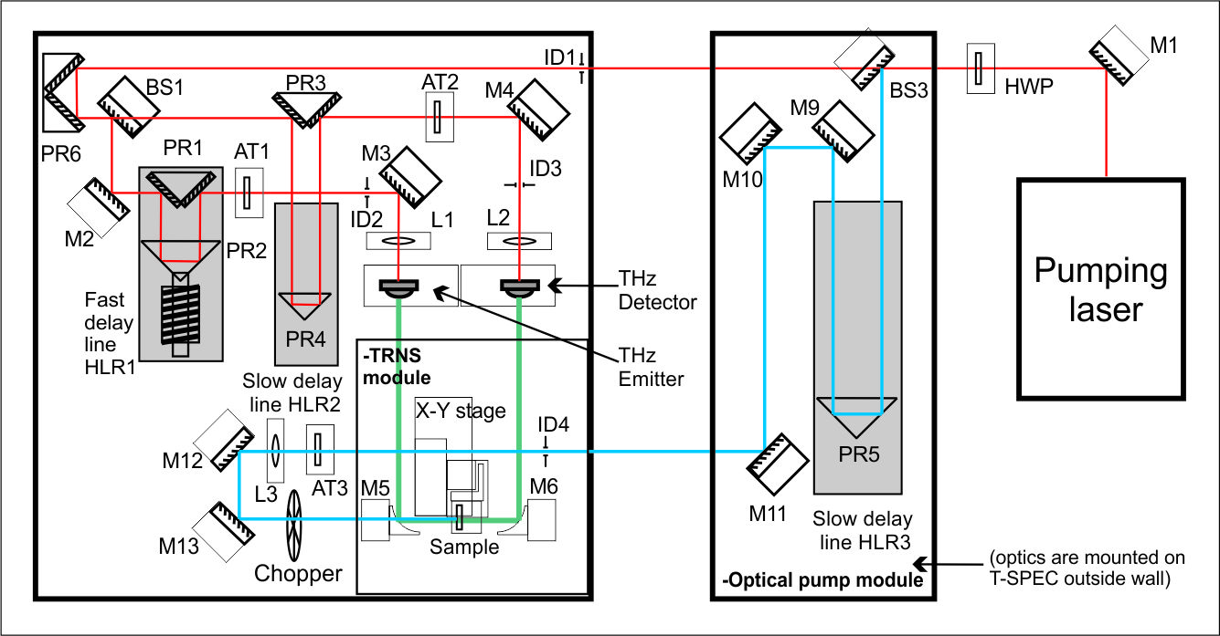 T-SPEC spectrometer can be adopted for optical pump THz probe measurements. This allows investigation of carrier dynamics in semiconductors, nanocrystals, and other materials. One part of additional optics is placed inside spectrometer; another part with delay line is mounted on T-SPEC outside wall. Measurement can be done up to 1 ns with temporal resolution of approx. 0.5 ps.